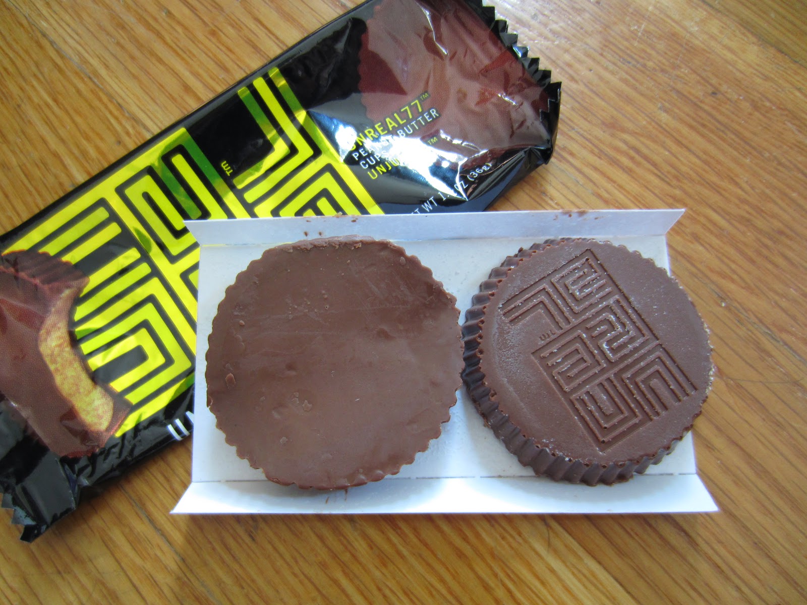 Next up, we have UNREAL #77 Peanut Butter Cups, and I have to say that my husband and I were most excited about trying these. We are peanut butter and chocolate freaks! We have tried about a bazillion different brands from Reese's to Newman's Own to Trader Joe's brand -- we can't get enough of these little guys. So how does UNREAL compare? My husband and I both agreed that the peanut butter was overwhelmed by the chocolate, but you can definitely tell it's there. It adds a salty element to the chocolate you wouldn't have otherwise, and we all know that sweet & salty is a pretty delicious element. This reminded me a lot more of natural brands because it wasn't as sweet as the other guys. The chocolate just melts in your mouth and lingers on your tongue. It's pleasant but something is missing, and I think that something is a bolder, peanut butter taste. I'd still reach for these over other cups at the convenience/drugstore, because the chocolate tastes so much better!
